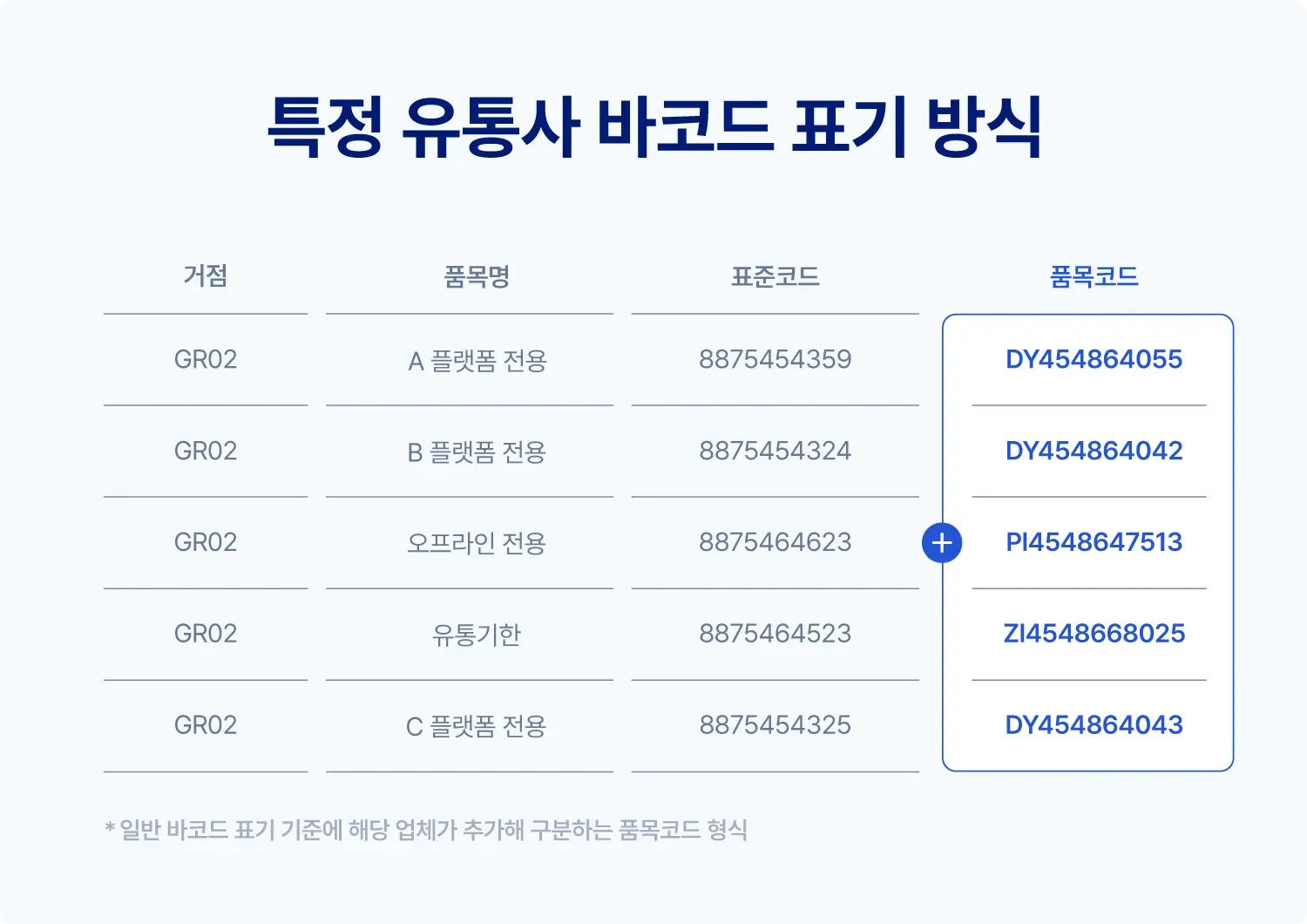 특정 플랫폼 사의 경우 보편적으로 쓰이는 ‘표준코드‘를 제외하고, 자체적으로 ‘품목코드‘를 사용합니다. 그리고 품목코드에는 플랫폼에서 납품하는 별도의 유통 채널과 관련된 정보를 입력합니다. 예를 들어 오프라인 유통의 경우 앞자리를 PI로, 유통기한 별도 표기의 경우 앞자리를 ZI로, 온라인 중 A 채널은 DY로 코드 앞자리를 구분하는 등 일반적으로 사용하는 표준코드 외에 품목코드를 통해 채널별 유통 정보를 추가로 기재하는 것이죠. 물류센터 내에는 동일한 상품이기에 품목코드가 달라도 입고된 순간부터 같은 렉 안에 보관하지만, 시스템상에는 유통되어야 하는 채널별로 품목코드 번호가 모두 달라 전산상에 등록된 재고 수량과 실제 상품 수량을 조사하려면 일일이 바코드를 직접 확인해야 하는 번거로움이 있습니다.