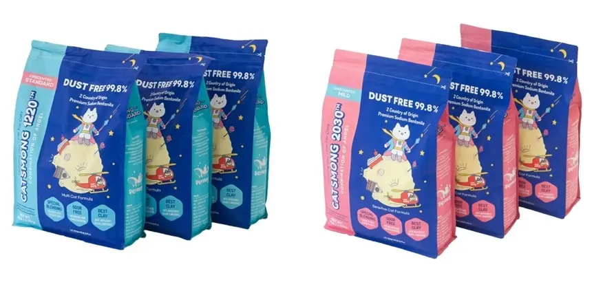 가장 대표적인 상품은 ‘캣츠몽1220‘과 ‘캣츠몽2030‘ 벤토나이트 고양이모래입니다. 2제품 모두 6.35kg, 무향입니다. 원료 구성은 미국 와이오밍산과 러시아 시베리아산 A급 소디움계 천연 벤토나이트를 블렌딩한 혁신적인 콘셉트로 고양이 모래의 필수조건인 먼지 청결성·기호성·응고력·탈취력을 모두 충족한 프리미엄급 기능성 모래입니다. 캣츠몽1220은 중간 입자와 가는 입자를 블렌딩한 스탠다드 타입, 2030은 고운 입자에 가는 입자를 블렌딩한 마일드 타입입니다.