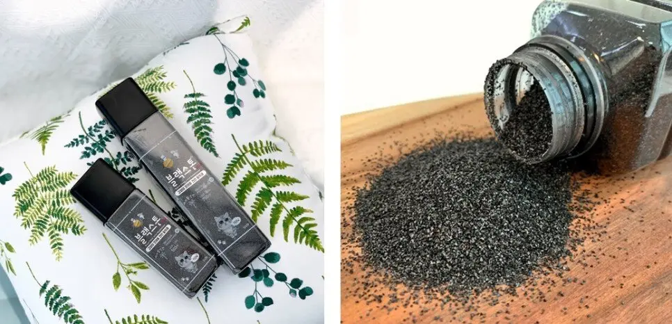 다음은 ‘블랙스톤2040‘ 고양이모래 탈취제와 ‘수호천사‘ 고양이 모래 삽입니다. 블랙스톤2040은 고양이 분변 냄새 탈취제로 가장 효과적인 1등급 천연 야자 활성탄으로 만든 제품으로 기존 활성탄의 고질적인 약점인 손·발 묻음과 먼지를 특수 공정으로 깨끗이 제거한 최상급 원료로 제조합니다. 어떤 종류의 고양이 모래라도 2~3일에 한 번씩 뿌려주면 고양이 분변(대소변) 냄새를 초기부터 확실히 잡아줘 집안 공기를 24시간 내내 청정하고 쾌적하게 만들 수 있습니다.