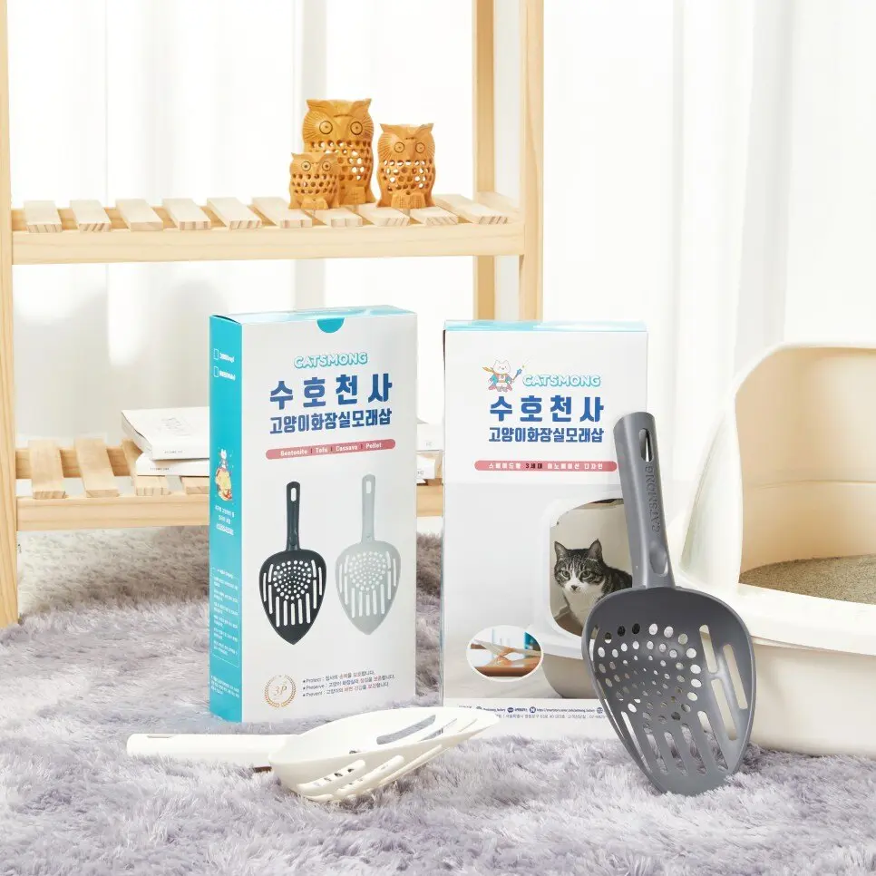수호천사 고양이 모래 삽은 고양이 화장실의 필수품으로 분변물을 흡수, 응고된 덩어리를 퍼낼 때 꼭 필요한 제품입니다. 쓰레받기 모양의 2세대 스타일과 달리 유선형의 곡선 구조로 독자 개발한 3세대 고양이 모래삽으로 화이트와 그레이 2타입이 있습니다. 고양이 보호자의 손목 놀림이 자유롭고 편하며 가볍고 튼튼해 잘 부러지지 않고 크기가 다른 수십 개의 구멍으로 고양이 분변물을 깔끔하게 퍼낼 수 있어 고양이 화장실의 위생과 고양이의 건강, 고양이 모래의 청결을 지켜주는 찐 ‘수호천사‘ 모래 삽입니다.