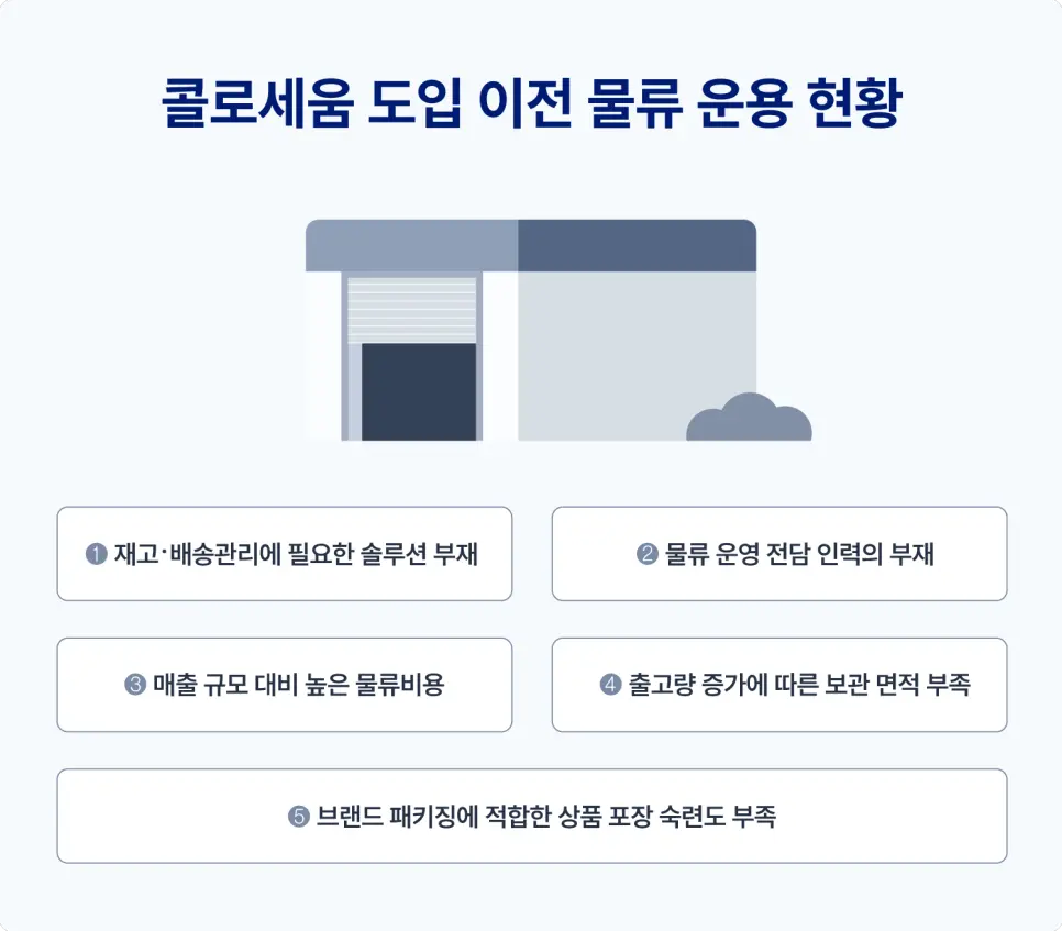직접 물류 운영 인력을 고용해 자체 물류를 진행하기보다 고용비, 인건비, 부자재 등 비용과 투입 인력을 절감할 수 있는 방안으로 물류대행업체를 이용하는 것이 모든 난제를 수월하게 해결할 수 있을 것으로 판단했습니다. 그러던 중 물류대행업체를 알아보게 되었고, 여러 곳에서 견적서를 받아보았지만 고객 맞춤형으로 커스터마이징 서비스를 제공하는 물류대행업체가 자사 브랜드 물류를 수행하는 데 가장 효과적일 것이라고 판단해 콜로세움을 이용하게 되었습니다.